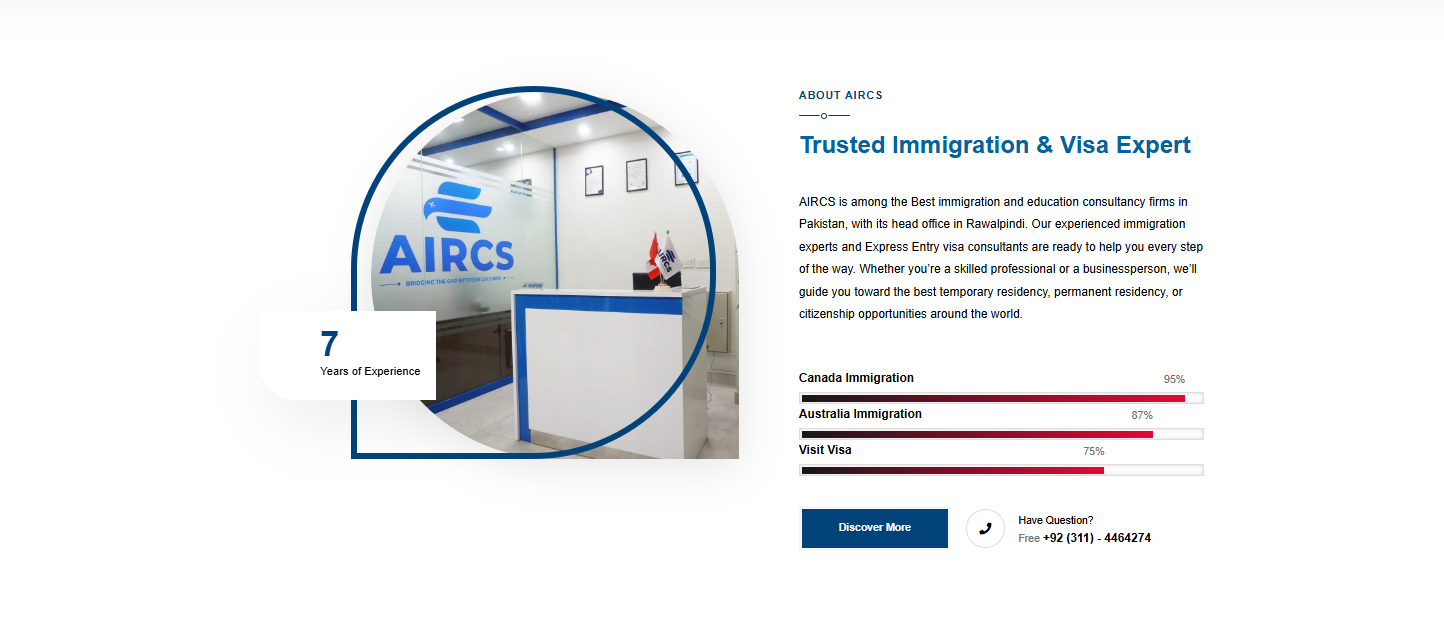 AIRCS is among the Best immigration and education consultancy firms in Pakistan, with its head office in Rawalpindi. Our experienced immigration experts and Express Entry visa consultants are ready to help you every step of the way. Whether you’re a skilled professional or a businessperson, we’ll guide you toward the best temporary residency, permanent residency, or citizenship opportunities around the world.