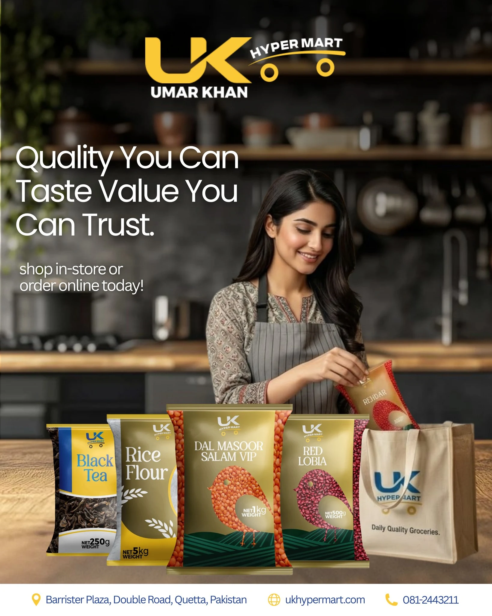 UK Hypermart is a leading supermarket in Quetta, Pakistan, offering a wide range of groceries, fresh food, beverages, imported items, snacks, personal care, and household essentials under one roof. Known as one of the best retail stores in Quetta, we provide high-quality products at affordable prices with excellent customer service. Whether you are looking for daily essentials or premium imported goods, UK Hypermart ensures a convenient and reliable shopping experience. We also offer online shopping in Quetta with fast home delivery, allowing customers to order anytime from the comfort of their home. Visit UK Hypermart today for quality, value, and convenience.